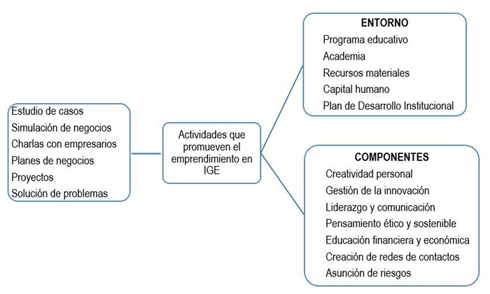 El trabajo de análisis permitió la identificación de algunas de las competencias del programa emprendedor de IGE con los pilares del ecosistema emprendedor señalado anteriormente; se encuentran los pilares habilidades (2) y soporte cultural (5), los cuales deben ser reforzados como tarea del sistema educativo; también el pilar capital humano (8) es impulsado en este programa en estudio, el cual está enfocado en el desarrollo de las habilidades directivas y para ello se integran actividades que aumentan la experiencia del alumnado y su capacidad de innovar; además, se relacionan con los pilares innovación del producto (10) e innovación del proceso (11) que se establecen como resultado de la capacidad creativa e innovadora del estudiante.