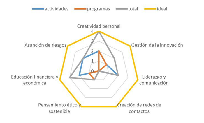 En un ejercicio de visualización radial a partir de los resultados anteriores se utilizó una escala ideal de 4 puntos sobre las actividades y los contenidos del programa curricular que detonan el emprendimiento, y se observa que en el programa emprendedor del ITSMante sólo se potencian la creatividad personal y la educación financiera y económica del estudiante, dejando de lado las demás competencias que se han identificado como necesarias para lograr el perfil emprendedor que se busca en el estudiante de la carrera de Ingeniería en Gestión Empresarial; lo anterior confirma la proposición teórica ofrecida inicialmente, ya que las actividades actuales implementadas por la Academia son insuficientes para promover el perfil emprendedor, al no ser cubiertas todas las competencias específicas que integran dicho perfil, tal como se observa en la Figura 4 siguiente; particularmente es nula la inclusión de actividades que promuevan la creación de una red de contactos o empresas y tampoco hay un programa de liderazgo y comunicación o de asunción de riesgos, por lo que se reconoce un resultado general de 2 sobre el ideal de 4.