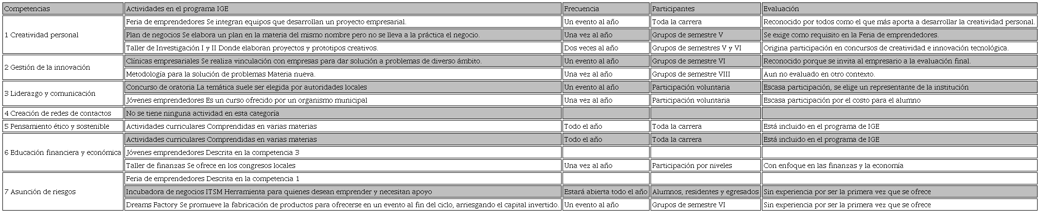 A partir de las competencias seleccionadas anteriormente y de las actividades que fomentan el emprendimiento se ha realizado un trabajo para indagar al interior de la organización cuáles son las actividades dentro del programa institucional de IGE que inciden en la adquisición de las competencias mencionadas, así como la frecuencia de tales actividades, los participantes y la opinión de la Academia sobre la efectividad o bondad de su implementación, quedando plasmados los resultados en la Tabla II siguiente: