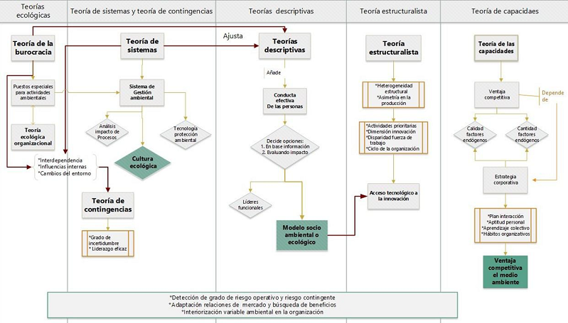 on varias las corrientes teóricas, que pueden ser marco de referencia de las variables socio-ambientales en las organizaciones, cada una va integrando y aportando un enfoque relativo. En varios momentos, las teorías interactúan entre ellas para dar forma a la atención del riesgo ambiental, su detección y cuidado.