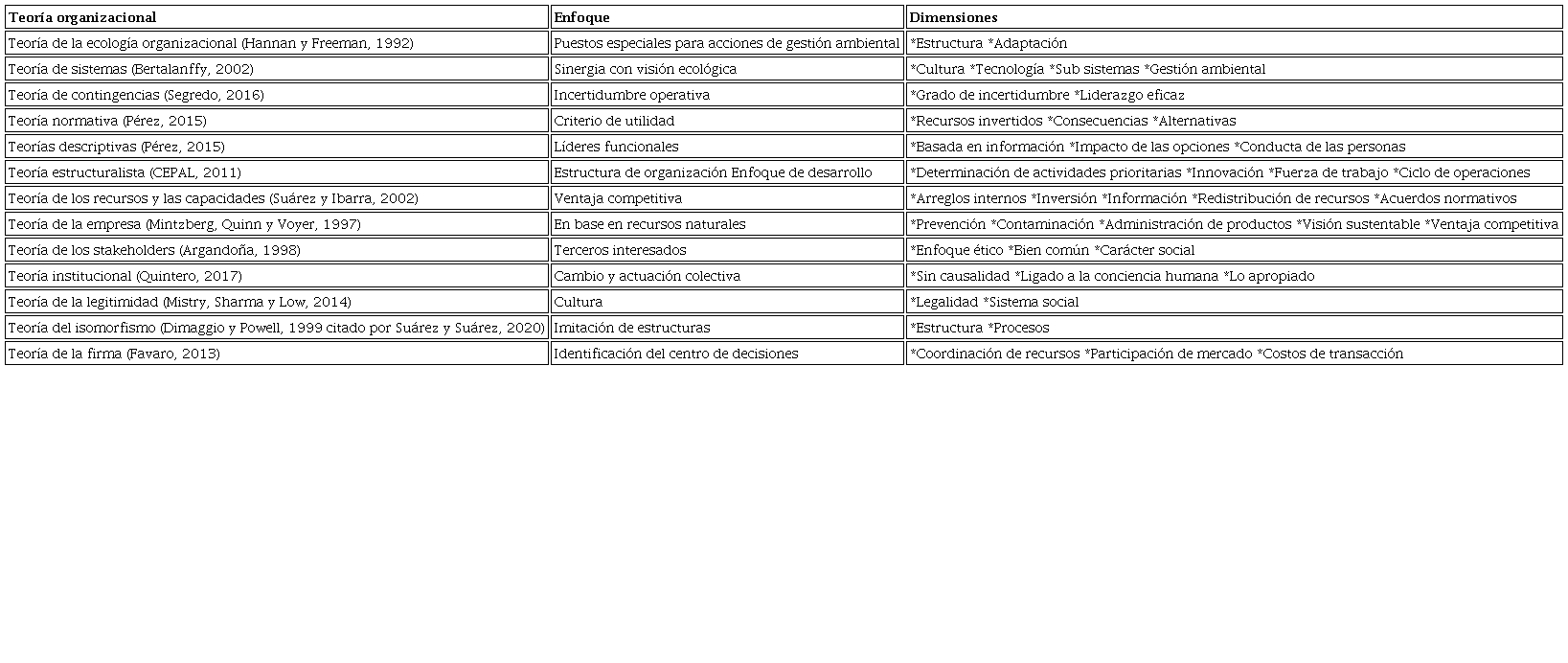 It is relevant and necessary to identify theories, in order to understand practice as a framework of reference, I have included in it the care of natural resources as a key element in business health and social commitment parallel to the productive function. In this sense this work reviews a group of organizational theories, their position and theoretical scope to detect theoretical conceptualization that allows an approach to the introduction and interpretation of the socio-environmental variable in the business plan.