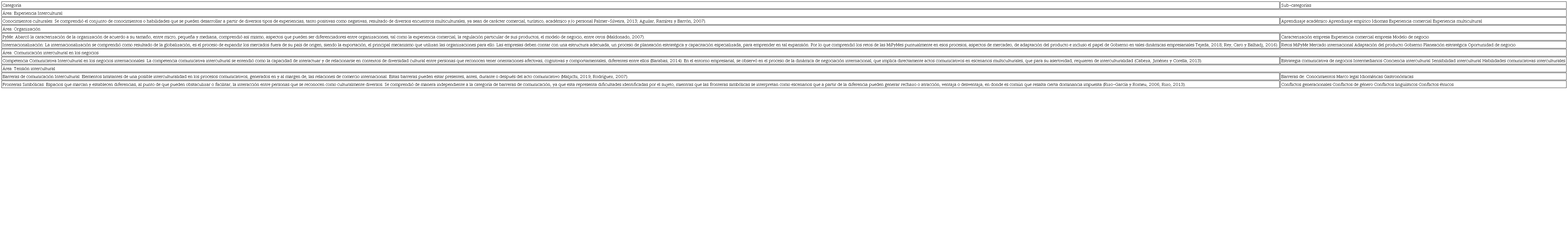 En la entrevista semiestructurada, se construyó un guion que buscó recolectar información de impacto en la formación y uso de la CCI, por lo que no se abordó únicamente las tres dimensiones de la competencia, así mismo, se comprendieron otras categorías relacionadas, las cuales se dividieron en dos grupos: aquellas que exploraron el fenómeno al interior de la organización y las que indagaban al empresario como tal, lo que implica que se tuvieron dos sujetos de investigación. En total, se profundizó en cuatro áreas de conocimiento generales: la comunicación intercultural en los negocios, la experiencia intercultural, la tensión intercultural y la organización, al interior de las mismas se exploraron las siguientes categorías: competencia comunicativa intercultural, barreras de comunicación intercultural, fronteras simbólicas, internacionalización y caracterización MiPyMe.