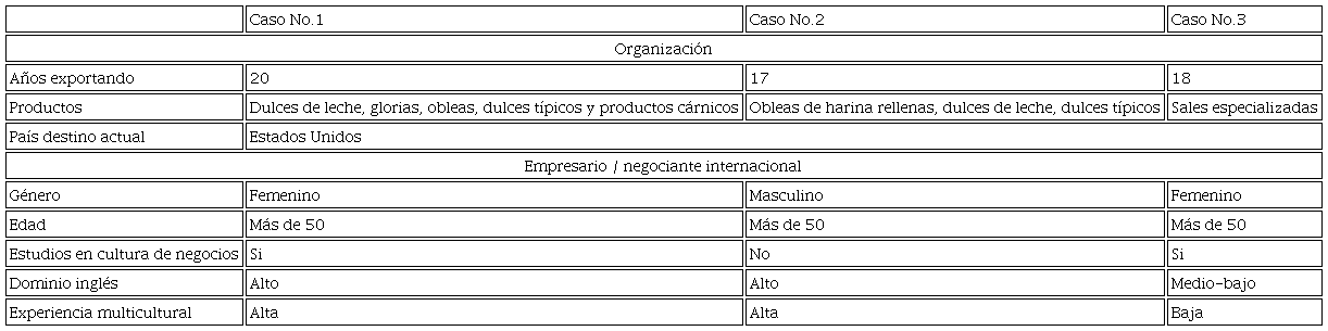 Esto evidencia además, cierta formalidad en las prácticas organizacionales al interior de la empresa, independientemente del tamaño de las mismas, ya que los tres casos comprendieron un proceso que se podría denominar sistemático en el cumplimiento de un objetivo final que es la exportación y la ampliación de sus mercados. Aunque se desconoce si estas prácticas de los sujetos han sido siempre de esta forma estructural, se asume, que la experiencia comercial y multicultural, les ha llevado a reconocer la importancia, de construir un camino a seguir para alcanzar una meta puntual, que es individual a título de negociación, pero a su vez que es colectiva, ya que el éxito en las ventas al exterior, representan mayor productividad y por tanto, mayores ingresos, más trabajo y mayor estabilidad a la empresa.