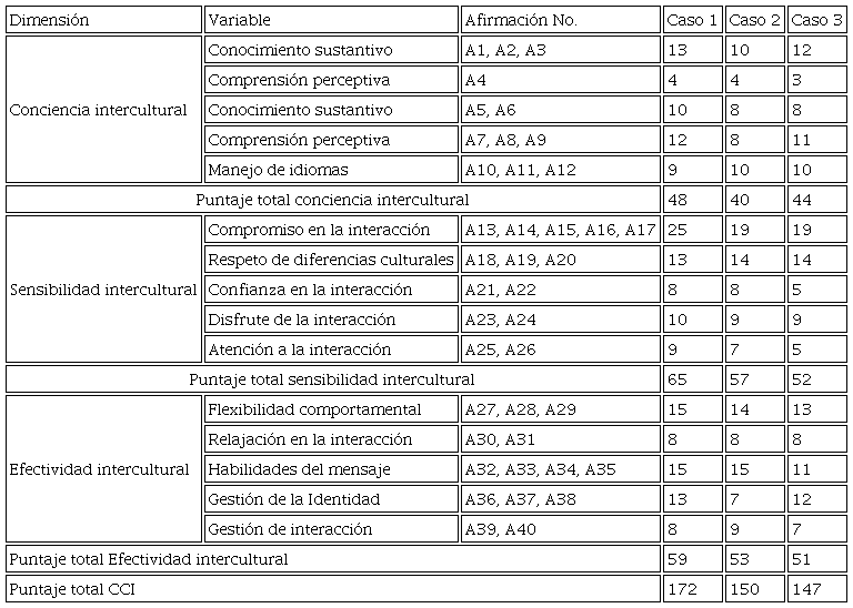 De esta manera, el sujeto del caso 1 con un puntaje total de 172 obtuvo un nivel de competencia comunicativa intercultural excelente, los casos 2 y 3, con 150 y 147 puntos consecuentemente, obtuvieron un nivel notable, lo que no es necesariamente algo negativo, simplemente indica que hay aspectos que podrían mejorar en la búsqueda de una mayor interculturalidad, la cual se expresaría en teoría, en procesos comunicativos más asertivos.