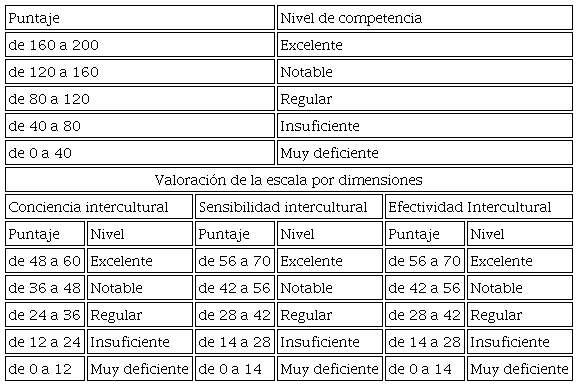 De la misma forma se estableció la valoración para cada dimensión, la conciencia intercultural abarcó 12 ítems por lo que su puntaje máximo es de 60 puntos, en donde de 48 a 60 se consideró un nivel excelente, de 36 a 48 un nivel notable, de 24 a 36 regular, de 12 a 24 insuficiente y de 0 a 12 muy deficiente. En cuanto a la dimensión de sensibilidad intercultural y de efectividad intercultural, ambas contaron con 14 ítems, por lo que el puntaje máximo en cada una es de 70 puntos, comprendidos así: de 56 a 70 se consideró un nivel excelente, de 42 a 56 notable, de 28 a 42 regular, de 14 a 28 insuficiente y de 0 a 14 muy deficiente.
