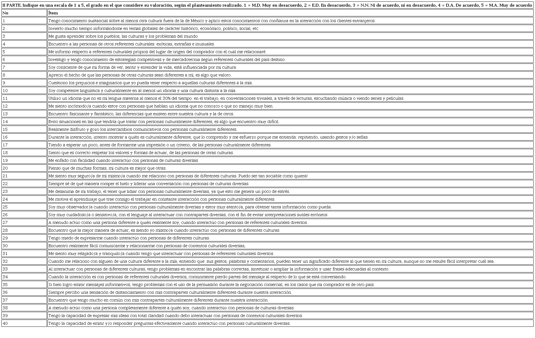 El formato que se aplicó correspondió a un cuestionario con dos apartados, uno inicial que recolectó datos sociodemográficos como nombre de la organización, estudios de cultura de negocios y experiencia multicultural - países de origen de contrapartes en la conversación. Una segunda parte donde se valoraron los ítems en una escala de 1 a 5 puntos, en donde 1 indicó un grado total de desacuerdo y 5 de total acuerdo. El cuestionario tuvo 40 planteamientos de los cuales algunos fueron afirmativos y otros negativos, para leer los ítems detalladamente dirigirse anexo A.