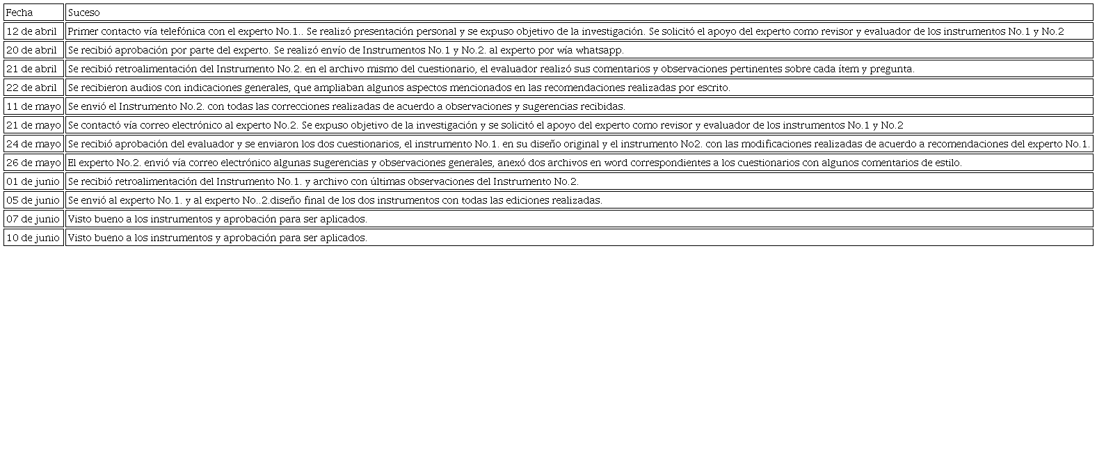 Dada la población reducida con la cual se trabajaría en esta investigación, se optó como mecanismo de validación, la valoración de expertos, se determinó como la herramienta más óptima, ya que el instrumento cuantitativo a aplicar correspondía a la adaptación de otros instrumentos ya validados previamente. Los dos valoradores especialistas en negocios internacionales, gozan de un campo de experiencia de más de 20 años cada uno, en los que han trabajado como gestores de proyectos, asesores y consultores de PyMes en México y Colombia. El contacto, la valoración, evaluación y retroalimentación con ellos fue vía telefónica, whatsapp y correo electrónico, en el anexo B. se incluye una tabla con la cronología del proceso mencionado.