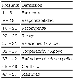 El cuestionario consiste de 50 preguntas cuyas respuestas se responden en una escala de Likert de 4 valores. Tiene el fin de identificar las percepciones subjetivas de las personas, así como de su comportamiento dentro de la empresa, conforme a las siguientes dimensiones: estructura organizacional del trabajo, responsabilidad, recompensa, riesgo, apoyo y calidez, estándares, conflicto e identidad-lealtad (García, 2009).
