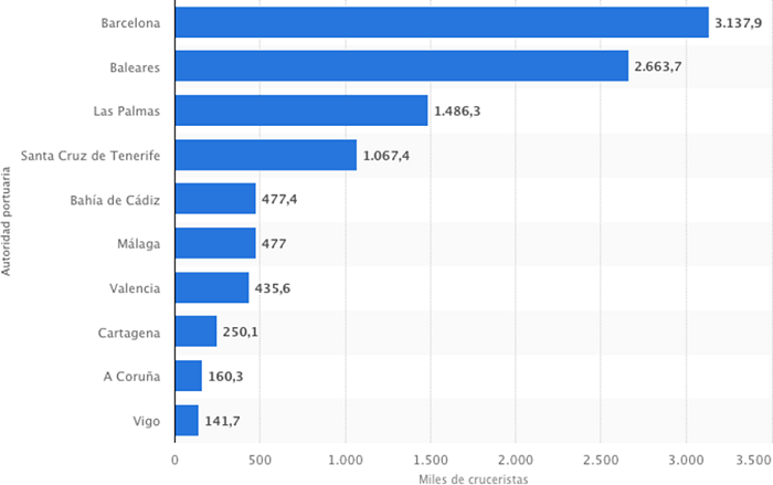 Asimismo, cabe destacar que la Autoridad Portuaria de Las Palmas posee el tercer lugar en el ranking de puertos españoles que más pasajeros de cruceros reciben al año, tal y como se puede apreciar en el Gráfico 1.