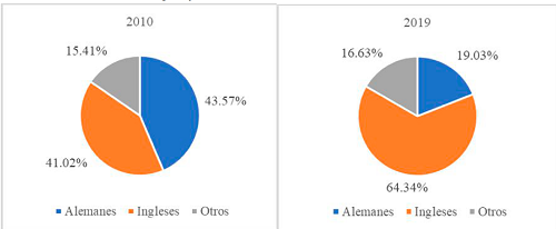 Además, a continuación se analizarán las pérdidas teniendo en cuenta los países de procedencia de los pasajeros. En el Gráfico 10, podemos observar como en 2010 los pasajeros ingleses y alemanes representaban un porcentaje similar del total de pasajeros que desembarcaban en el Puerto de La Luz y Las Palmas, con una presencia mayor de viajeros alemanes. Sin embargo, en 2019 vemos como un 64,34% de los pasajeros proviene de Reino Unido.