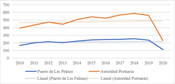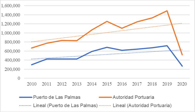 Asimismo, los gráficos muestran una comparativa entre los datos de la Autoridad Portuaria de Las Palmas y el Puerto de La Luz y Las Palmas. Al observar los gráficos se aprecia como la evolución de ambos a lo largo de los años es muy similar.