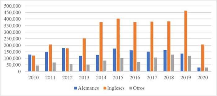 Por otro lado, se calcularán las predicciones teniendo en cuenta el país de origen de los cruceristas. Los pasajeros de nacionalidad Alemana e Inglesa son los más frecuentes según los datos obtenidos de la Autoridad Portuaria de Las Palmas. A continuación, se puede observar en el Gráfico 5 los datos obtenidos, los cuales reflejan el predominio de dichas nacionalidades entre los pasajeros de cruceros con operativa en el puerto.