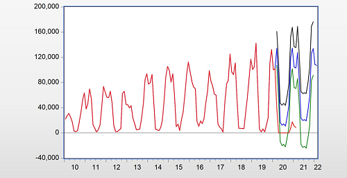 Finalmente, en un escenario normal, con los datos que tenemos a día de hoy, la recuperación económica de Alemania y Reino Unido se producirá a mediados de 2022. Esto se traduce en que se podría alcanzar el tráfico de pasajeros de cruceros, estimado en el modelo ARIMA, en la temporada de noviembre de 2022 a abril de 2023.