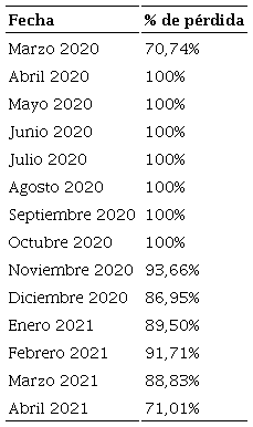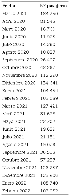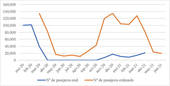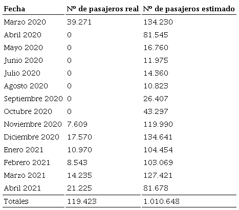 En la Tabla 5 se encuentran los porcentajes de pérdida del número de pasajeros que se produjo comparando los valores reales frente a los estimados por el modelo ARIMA.