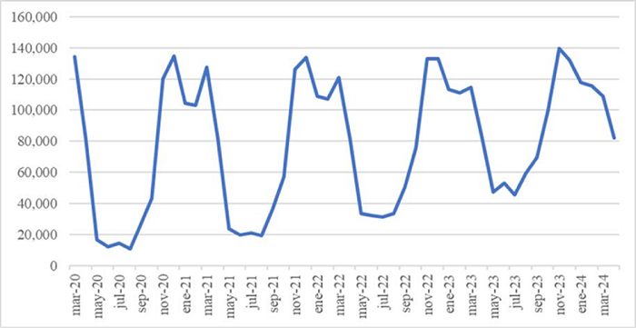 Finalmente, en el Gráfico 8 se puede apreciar cómo queda la serie del número de pasajeros obtenida mediante las predicciones del modelo ARIMA (marzo 2020 - febrero 2022) y mediante la aplicación del porcentaje de crecimiento obtenido (marzo 2022 - abril 2024). Asimismo, se puede observar como la serie mantiene su comportamiento estacional.