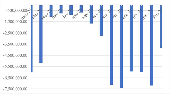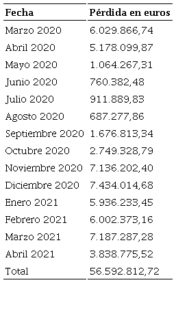 Con el fin de poder estudiar la pérdida económica que el COVID-19 ha generado en el sector de los cruceros con operativa en el Puerto de La Luz y Las Palmas, teniendo en cuenta únicamente el gasto medio del crucerista al desembarcar en la ciudad, se considerará, tal y como se ha señalado, un gasto medio por pasajero de 63,5 euros. Este gasto medio se multiplicará por el número de pasajeros para poder obtener la pérdida monetaria debida a la incidencia del COVID-19. Desde marzo hasta diciembre de 2020 la pérdida asciende a 33,6 millones de euros, mientras que en lo que va de 2021 la pérdida supone 23 millones de euros. Esto representa una pérdida económica total desde el comienzo de la pandemia en marzo de 2020 hasta la actualidad, abril de 2021, de aproximadamente 56,6 millones de euros. En la Tabla 6 y Gráfico 9 se puede observar la pérdida monetaria por meses.