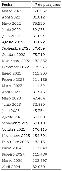Al aplicar estos porcentajes de crecimiento al número de pasajeros obtenido mediante el modelo ARIMA, obtenemos las siguientes predicciones del número de pasajeros que debería venir al Puerto de La Luz y Las Palmas, desde marzo de 2022 hasta abril de 2024, si no hubiera ocurrido la crisis provocada por el COVID-19 (véase Tabla 3).