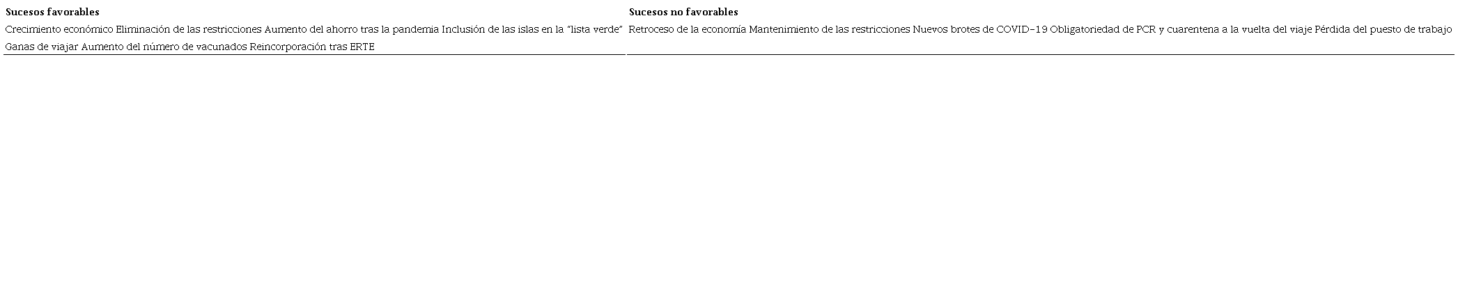En definitiva, podemos considerar que dependiendo de la evolución de distintos factores la recuperación del sector de cruceros con operativa en el Puerto de La Luz y Las Palmas será más rápida o no. En la Tabla 8 se han sintetizado algunos sucesos que pueden favorecer o no en la recuperación del sector de cruceros.