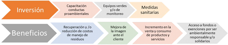 En esta perspectiva, la adopción de conductas pro ambientales y solidarias se sustenta en el costo-beneficio de inversión para las distintas posibilidades de acción, como: reducción del costo de manejo de residuos, inversión en equipos de monitoreo, mejora de la imagen ante el cliente, motivación para un posible incremento de consumo de sus productos y acceso a fondos de apoyo o exenciones por su imagen verde, solidaria y responsable, Figura 1.