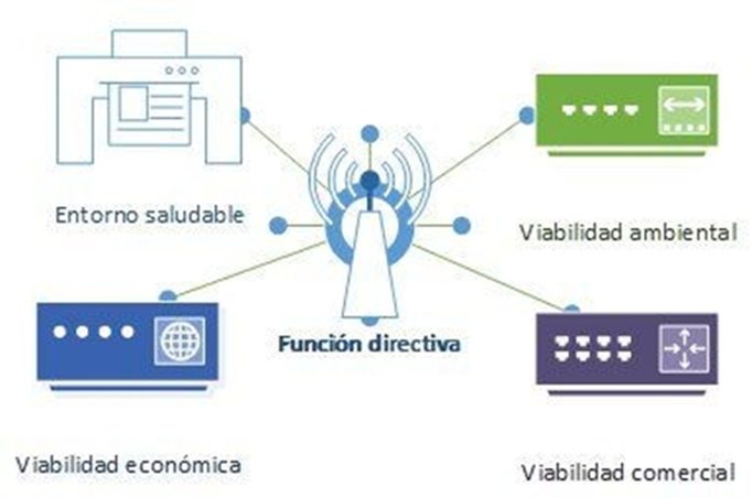 Como se simboliza en la figura, la función directiva es el criterio clave para aceptar y aplicar el Desarrollo Sostenible en las distintas actividades de la organización, siendo elementos básicos para lograrlo: el entorno saludable y la viabilidad financiera y operativa de los aspectos ambientales, reflejados en actividades comerciales y económicas.
