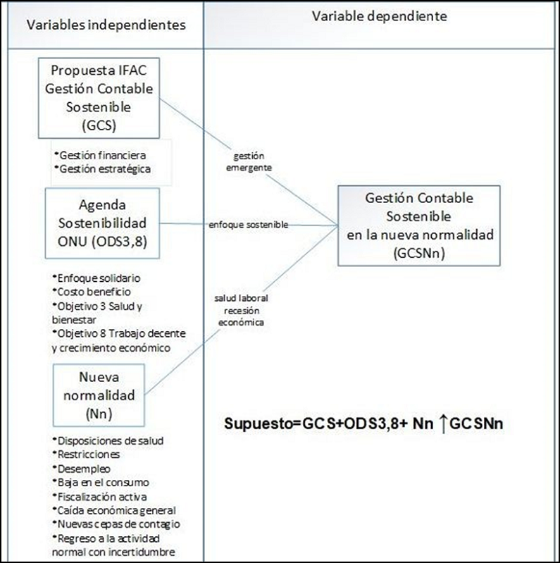 El modelo de investigación de la figura, establece cuatro variables: tres independientes y una dependiente como resultado emergente en la nueva normalidad COVID-19, de una Gestión Contable sostenible empresarial.