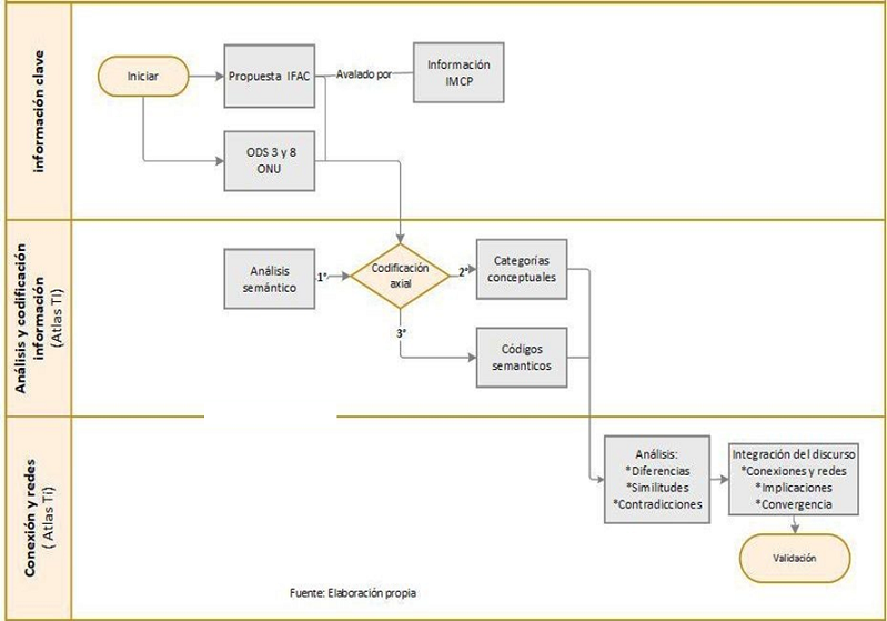 La metodología utilizada es cualitativa, aplicando un análisis del discurso contable del IFAC y de los Objetivos de Desarrollo Sostenible (ODS) 3 salud- bienestar , y 8 trabajo decente-crecimiento económico de la ONU, analizando las afinidades y diferencias entre la propuesta contable y la agenda sostenible.