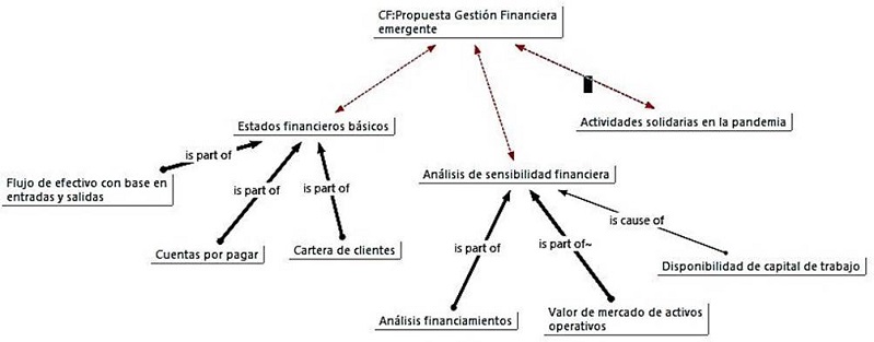En el análisis semántico de la estructura de la propuesta de Gestión Financiera emergente resalta la salud financiera a partir de los recursos líquidos efectivos, la separación de la estrategia del financiamiento preferente por 3os y el énfasis en el mantenimiento del capital, con base en catorce acciones contables administrativas.