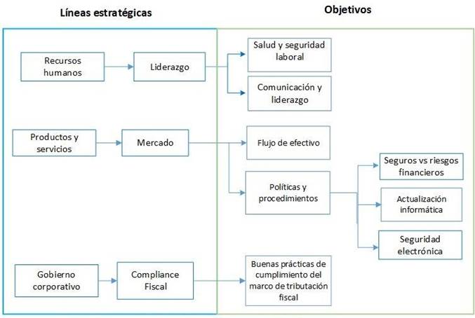 Las causas surgen por condiciones típicas próximas de las funciones básicas y de apoyo en las empresas, y los efectos se dan en razón de la asociación con una acción u omisión. En la figura se representan las causas como precedente y los efectos como resultados. De tal manera que de Recursos humanos como línea de atención, surge el liderazgo, necesario para lograr un efecto de salud, seguridad laboral, comunicación y liderazgo. A partir de la línea estratégica de Productos y servicios se enfoca al mercado, atendiendo un flujo de efectivo suficiente, el logro de políticas y procedimientos, que enmarcadas en la nueva normalidad se conviertan en un objetivo que incluya seguridad contra riesgos financieros, actualización informática y seguridad electrónica logrando el aprovechamiento de la tecnología. Como línea de Gobierno corporativo, se enfatiza el Compliance fiscal para cumplir y establecer buenas prácticas de las disposiciones tributarias reglamentarias que corresponden a su marco legal. El efecto causal en los objetivos se espera sea favorable, a partir de la claridad, las condiciones y enlace con las líneas estratégicas.