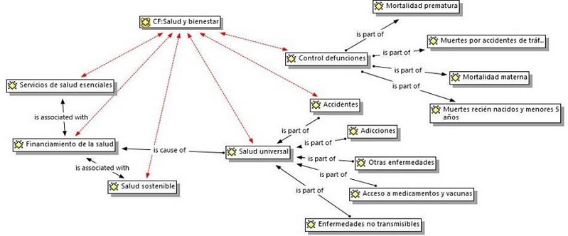 Como se representa en la figura, los códigos de sostenibildad del ODS 3 Salud y bienestar, a partir de los nodos de: salud universal, accidentes y control de defunciones, se dan conexiones de asociación, causa y parte de.