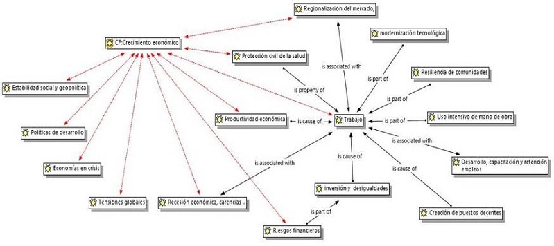 Por su parte el nodo de crecimiento económico como consecuencia del trabajo, la regionalización del mercado, la protección civil de la salud y la productividad económica, establecen códigos como metas a atender y superar por cada país, como la estabilidad social y geopolítica, politicas de desarrollo, atención de economías en crisis y tensiones globales.