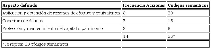 El primer resultado encontrado del análisis semántico fue la conceptualización de la Gestión Financiera la cual a través de 36 códigos semánticos, establecieron al modelo de gestión con acciones de: información, diagnóstico, estrategias, control, reglas y procedimientos, como se detalla en la Tabla 1.