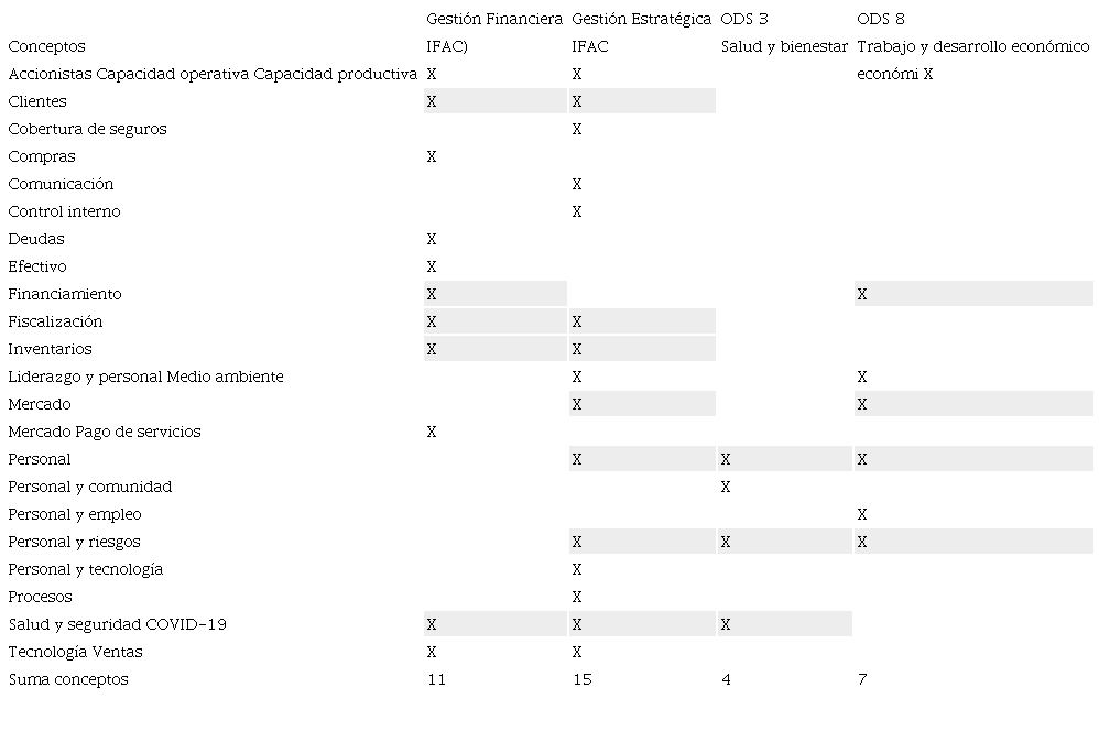 Los códigos semánticos y conceptuales se dirigen a tres aspectos: funcionamiento operativo, capacidad operativa y salud laboral , en donde la propuesta del IFAC de atención contable es de innovación creativa emergente en la Gestión Financiera y en la Gestión Estratégica para enfrentar el tránsito , efectos y nueva normalidad de la pandemia COVID-19.