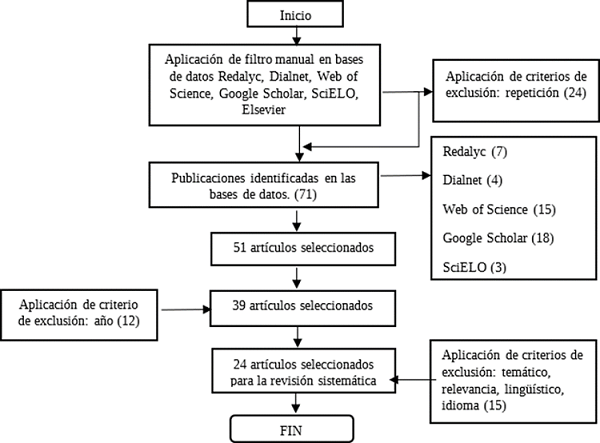 En la búsqueda de información se analizaron 71 estudios elaborados en países de Latinoamérica, en idioma inglés y español publicados entre los años 2007 y 2021 en las bases de datos de Redalyc, Dialnet, Web of Science, Google Scholar, SciELO y Elsevier seleccionando 24 artículos de acuerdo a los criterios de inclusión determinado en la metodología.