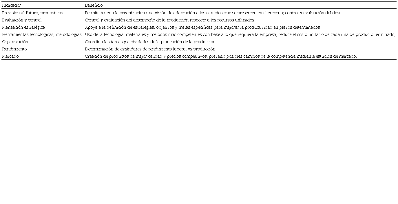 Se muestra una tabla describiendo los beneficios que las empresas obtienen de la productividad, en la primera columna se presenta los indicadores clave, esto permite percibir los beneficios de forma específica y de forma particular en la organización, en la segunda columna se describen los beneficios de acuerdo a su indicador para la construcción de una estrategia sólida de productividad y generar la competitividad empresarial esperada (Tabla 1).