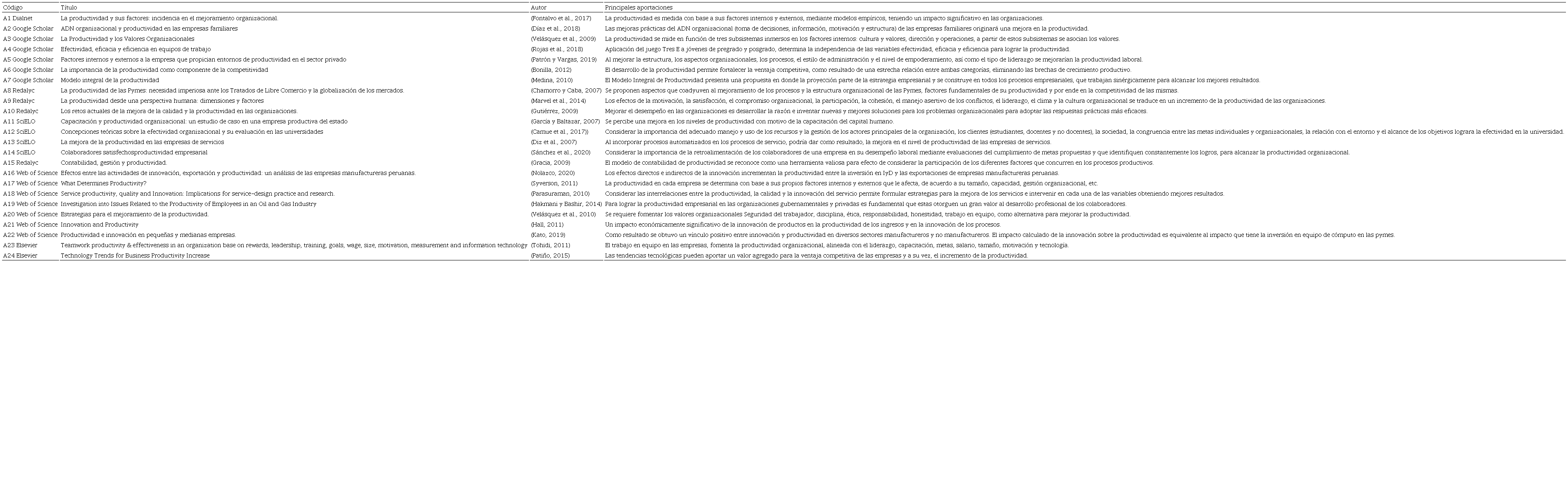 A continuación, se presentan los 24 artículos seleccionados, los cuales cumplieron con los criterios de inclusión aplicados. En la siguiente tabla (Tabla 2) se muestran sus principales aportaciones sobre aspectos que dichos estudios consideran para el incremento de la productividad empresarial en diferentes sectores e industrias.