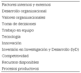 De igual forma se debe considerar la evaluación y aplicación del desarrollo organizacional, valores organizacionales, la toma de decisiones, el trabajo en equipo, la tecnología, la innovación, la inversión en investigación y desarrollo (IyD), la competitividad, la evaluación de los recursos disponibles y los procesos productivos, si se logra que estos aspectos sean fortalecidos en la organización, permitirá que la productividad se incremente y propicie a la creación de una ventaja competitiva sólida.