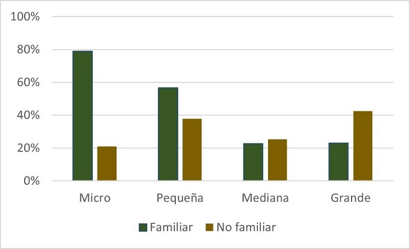 Del total de empresas de la muestra, al realizar la separación por tamaño, tal como se puede observar en la Figura 1 que las EF se concentran principalmente en los tamaño micro y pequeño, ya que estos estratos agrupan el 74.7%, los hallazgos son congruentes con el estudio previo de San Martín Reyna y Duran Encalada (2017), se destaca que conforme el tamaño de la empresa aumenta, disminuye la proporción de organizaciones dirigidas por miembros de una familia, de tal forma que en el estrato de las empresas grandes de cada tres empresas dos pertenecen al grupo de las ENF.