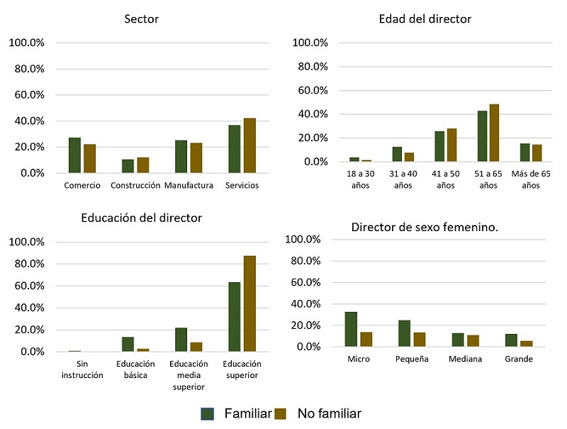 Con respeto a las características generales de las EF, estas se muestran en la Figura 2, donde se puede apreciar que existe una mayor concentración de estas organizaciones con respecto a las ENF en los sectores de comercio y manufactura. Así mismo, los resultados sugieren que los directores generales de las EF son más jóvenes, ya que el 41.7% de los directores de estas organizaciones tienen menos de 50 años, mientras que en las organizaciones no familiares esta proporción es del 37.1%.