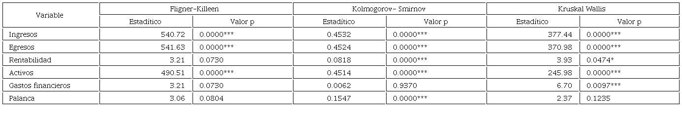 Con respecto a la prueba estadística de comparación de medias, dada la presencia de datos atípicos y su potencial influencia en un comportamiento heterocedásticos de la muestra, se optó por utilizar la prueba Kolmogorov-Smirnov con el ajuste de Lilliefors cuya hipótesis de contraste es que los datos presentan una distribución normal. Mientras que para validar el cumplimiento del supuesto de homocedasticidad en la varianza de las empresas familiares y no familiares se usó la prueba Fligner- Killeer, porque es robusta en lo referente a la falta de normalidad, cuya hipótesis nula es que las varianzas de los grupos de comparación son iguales.