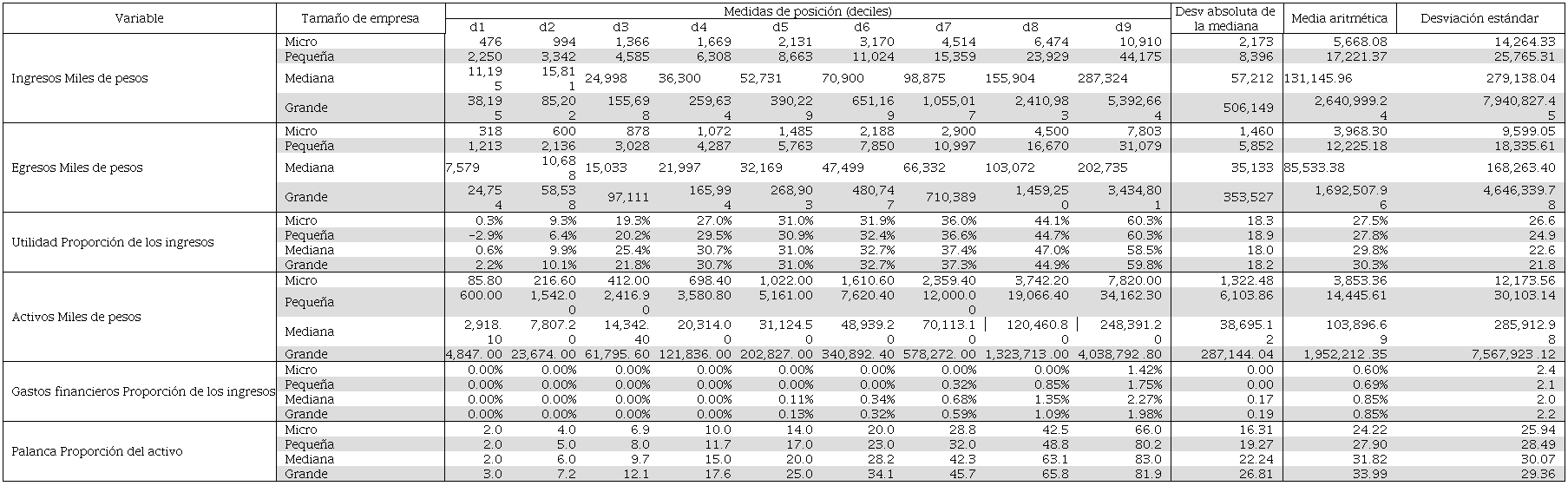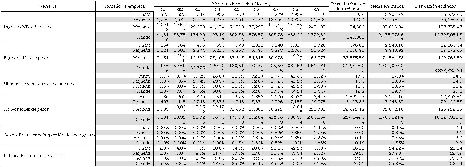 En la exploración inicial de los datos se identificó la presencia de datos atípicos, y dado a que la media aritmética y la desviación estándar son parámetros sensibles a los valores extremos, se consideró la conveniencia de utilizar estadísticos no paramétricos que son robustos a la presencia de datos atípicos (Leys, Ley, Klein, Bernard, y Licata, 2013). En consecuencia, para el estudio también se reporta la mediana como medida de tendencia central y la desviación absoluta de la mediana como medida de dispersión, en el Anexo 1 y 2 se encuentran reportadas estas variables junto con los deciles de las variables seleccionadas.