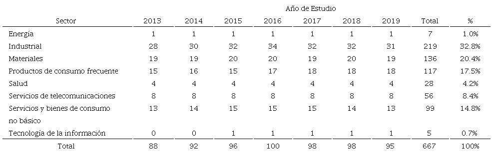 La muestra de estudio se conforma de las empresas que cotizan en la Bolsa Mexicana de Valores (BMV) durante el periodo 2013-2019 y de acuerdo a la clasificación de sectores que adopta la BMV: Energía, Industrial, Materiales, Productos de Consumo Frecuente, Salud, Servicios de Telecomunicaciones, Servicios de Bienes y Consumo no Básico y de Tecnología de la información. De las 145 empresas listadas se excluyeron 26 correspondientes al sector de Servicios Financieros y 17 compañías de las cuales su información no está disponible. Es importante señalar que del total de empresas cotizadas, 2 se encuentran suspendidas, 2 cerraron y 3 fueron eliminadas por ser de reciente creación (2016) y la otra del sector Materiales por falta de información financiera completa en el periodo de estudio, el cual comprende del año 2013 al 2019. Las muestra final está conformada por 101 empresas y 667 observaciones-año. La tabla 1 muestra la conformación de las unidades analizadas por año y sector industrial.