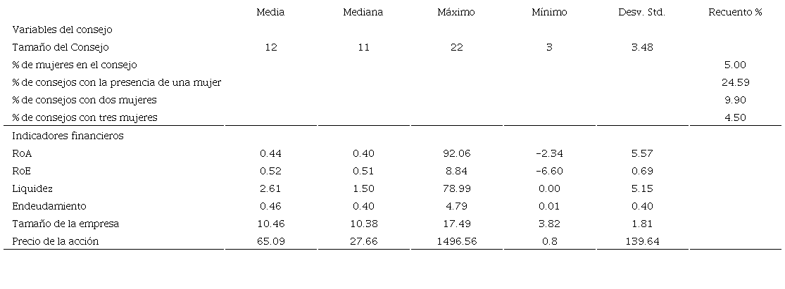 La tabla 2 describe los estadísticos de las variables de investigación. Se pone de manifiesto que el consejo de administración en promedio está conformado por 12 consejeros, un máximo de 22 y un mínimo de 3. Se demuestra que el porcentaje de mujeres en los consejos de las compañías que cotizan en la BMV alcanza una media de 5% durante el periodo de análisis, mientras que en 2013 se registra un 5% y en 2019 apenas se incrementa a 7%. De las 667 empresas que componen la muestra, el 24.59% de los consejos cuenta con una mujer, el 9.90% cuenta con dos y solamente el 4.50% de las empresas cuenta con tres mujeres en los consejos; el 1.95% de los consejos cuenta con más de 4 mujeres, siendo 5 el número máximo de mujeres ocupando estos lugares. El 59.07% de las empresas analizadas no han incluido a mujeres en sus consejos de administración.
