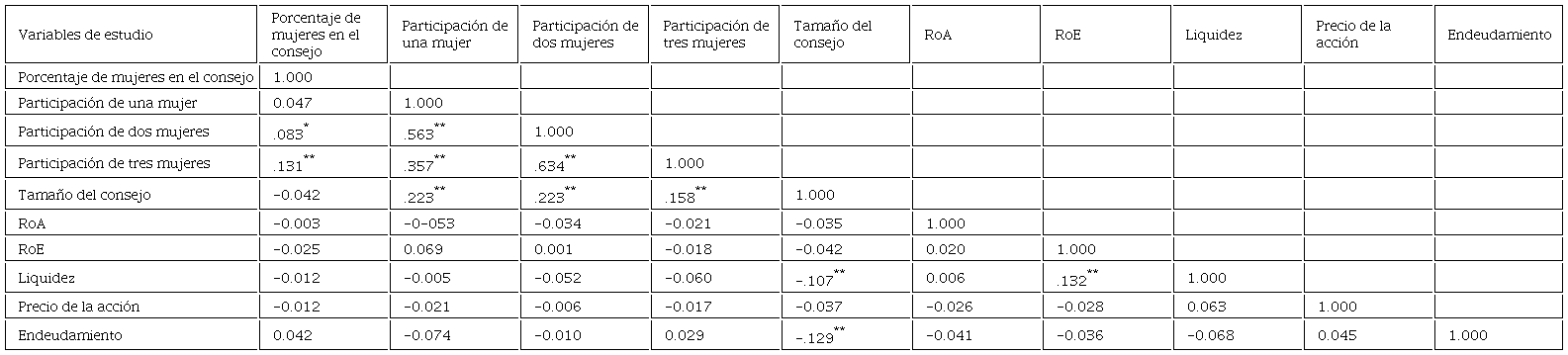 La tabla 3 explora las correlaciones entre las variables de investigación. Se evidencia una correlación positiva entre las variables de participación de mujeres en los consejos y el tamaño del consejo (p=0.01) y entre el RoE y la liquidez (p=0.01). Por el contrario, una correlación negativa entre el tamaño del consejo y el RoE y nivel endeudamiento (p=0.01) No se generan problemas de correlación relevantes entre las variables de investigación.