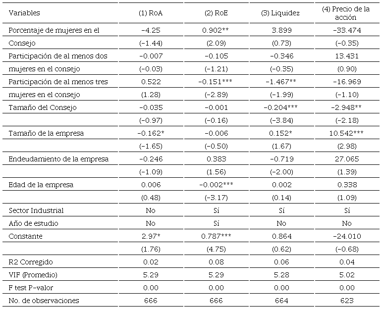 La tabla 4 presenta el análisis de regresión múltiple con errores estándar corregidos y se controla por efectos fijos para las variables de sector industrial y año de estudio. La columna 1 establece la relación entre las variables de género y de control sobre la rentabilidad (RoA). Se observa un efecto significativo y negativo entre el tamaño de la empresa y el RoA (p=0.10), no se observa un impacto significativo de las variables de género en el consejo sobre el RoA. En la columna 2 se evidencia un efecto favorable entre la representación de mujeres en el consejo y los indicadores de RoE (p=0.05); sin embargo, cuando la presencia es de 3 mujeres, el efecto es negativo. Esto pudiera deberse a que, en el contexto de México, no se ha alcanzado una participación de las mujeres representativa en la toma de decisiones. Esto nos lleva a aceptar parcialmente la H1 y a rechazar la H4, que hace referencia a que cuando se alcanza la masa crítica el efecto es favorecedor. En la columna 2, también se observa que la edad de la empresa disminuye el RoE. Con respecto a la liquidez, la columna 3 evidencia que la participación de tres mujeres o más en el consejo y el tamaño del consejo, disminuyen la liquidez (p=0.05), mientras que el tamaño de la empresa la incrementa (p=0.01). Lo anterior nos lleva a rechazar la H2. Finalmente, la columna 4 muestra que el tamaño del consejo (p=0.05) disminuye la liquidez y el precio de la acción, mientras que el tamaño de la empresa los favorece la liquidez (p=0.10) y el precio de la acción (p=0.01). Estos resultados nos llevan a rechazar la H3.