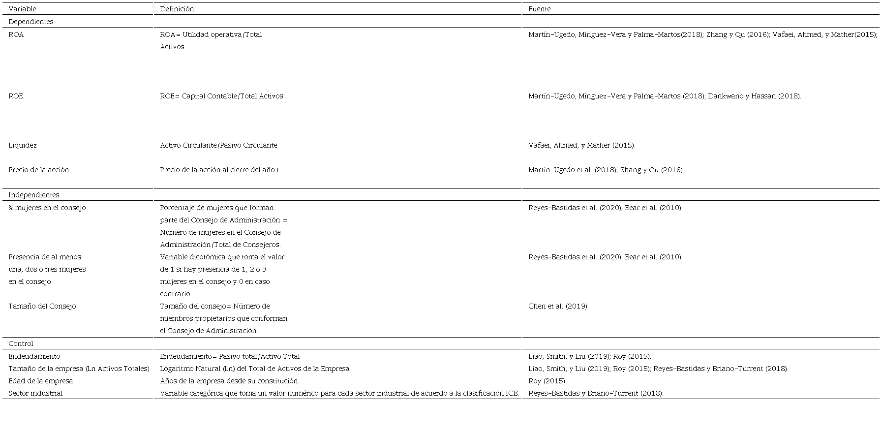 La variable dependiente se integra por los indicadores de rentabilidad (el RoA y el RoE), la liquidez y el precio de la acción. Las variables independientes se relacionan con la dimensión de género en el consejo (porcentaje de consejeras con respecto al total, presencia de una, dos o tres mujeres en el consejo). Las variables de control agregadas al modelo son tamaño del consejo, endeudamiento de la empresa, tamaño de la empresa (Ln Activos Totales), edad de la empresa, sector industrial al que pertenece y el porcentaje de crecimiento en sus ventas. El apéndice 1 muestra la medición de las variables de estudio. Los modelos econométricos son: