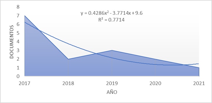 Price (1963) sostiene que los documentos se duplican cada 10 o 15 años, pero se demuestra que la proporción de la producción científica sobre calidad educativa en el contexto ecuatoriano es menor, pasando de publicar 7 documentos en el 2017 a 1 en el 2021, presentando una tasa de variación del -85,71%, con un coeficiente de determinación R2= 77,14% de la línea de determinación polimonial de segundo orden, según se indica en la Figura 1.
