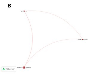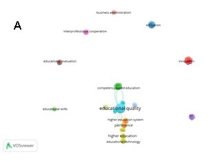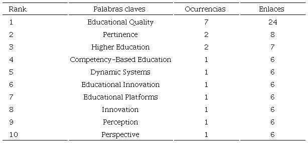 Las Figuras 2 y 3 permiten observar el análisis de la red de co-ocurrencias entre palabras claves (Da Silva et al., 2019), se identifica un total de 59 términos asociados al tema de calidad educativa, donde 3 cumplen con la condición de 2 ocurrencias mínimas, de las cuales, las cuales son: “EducationalQuality”, “Pertinence”, “Higher Education” (Véase Figura 3), términos que coinciden al considerar como 1 el número mínimo de ocurrencias formando un total de diez clusters (Figura 2). Así también, en la Tabla 4, se puede observar las tres palabras claves con mayor número de coocurrencias y enlaces.