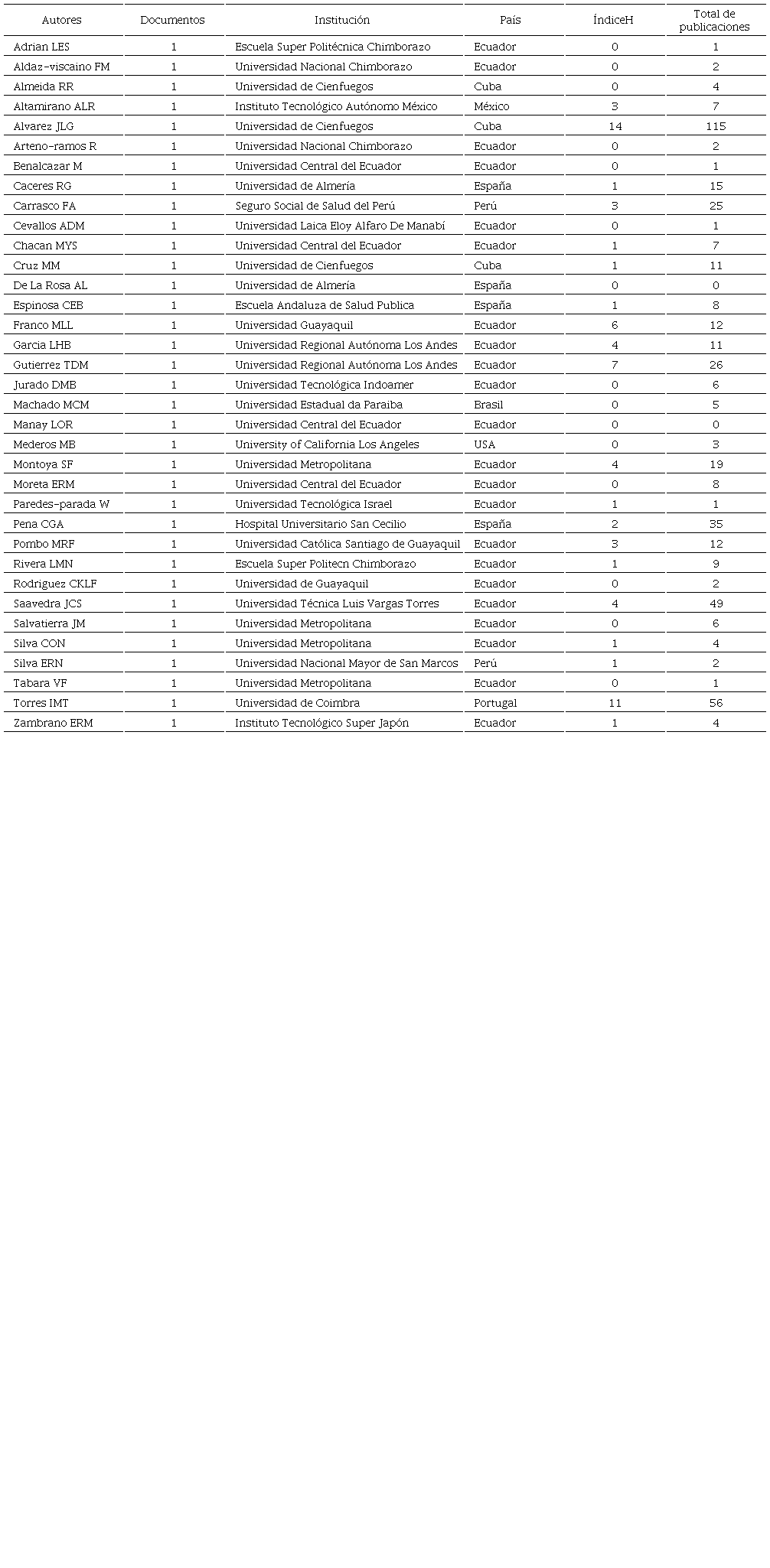 Así también, es necesario rescatar que el cubano José Luis Gil Álvarez de la Universidad de Cien Fuegos tiene el mayor índice H y la mayor cantidad de documentos publicados, 14 y 115 respectivamente, seguido por Isabel Moreno Torres de la Universidad de Coimbra en Portugal con índice H de 11 y con un total de 56 artículos publicados hasta diciembre de 2021, los mismos que publican en la revista “Universidad y Sociedad”, la cual, se encuentra adscrito a SCOPUS categorizada como cuarto cuartil.