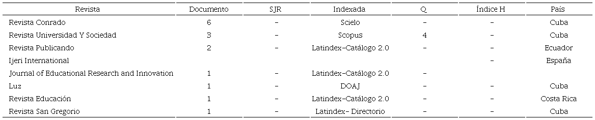 A continuación, en la Tabla 2, se muestran las 8 revistas científicas que alojan artículos relacionados a la calidad educativa en el contexto ecuatoriano, entre las cuales, el primer lugar pertenece a la Revista Conrado de Cuba indexada en Scielo, seguida con 3 publicaciones la Revista cubana Universidad y Sociedad ubicada en el cuarto cuartil del Scimago Journal Rank.