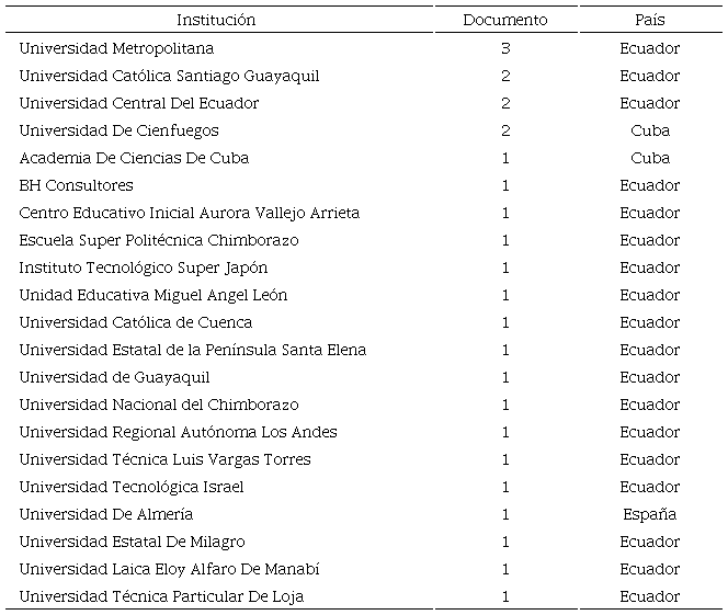 Así también, en la Tabla 3, de un total de 21 instituciones que mantiene filiación con los autores, se demuestran que las organizaciones mayormente productivas se encuentran radicadas en Ecuador, pero la Universidad Metropolitana, con 3 artículos, mantiene la mayor cantidad de manuscritos publicados, seguida por la Universidad Católica Santiago Guayaquil, Universidad Central Del Ecuador y la Universidad De Cienfuegos con valores superiores a la media de 1,24 documentos.